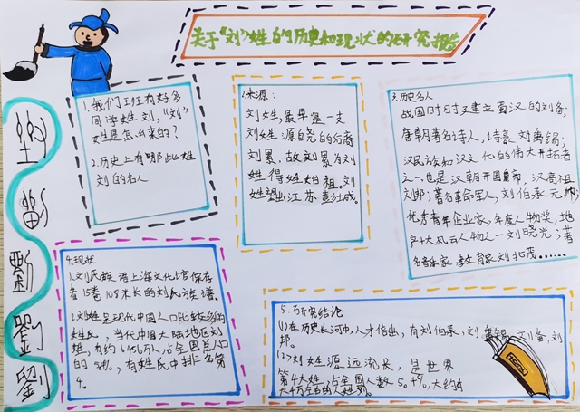 “赵钱孙李,周吴郑王……”百家姓中有着众多的姓氏,那你想知道自己的姓氏怎么来的吗?历史上你的姓氏都有哪些名人呢?你的姓氏在百家姓里位居多少名?你的姓氏在全国有多少人?带着这些有趣的问题,五年级的同学运用学过的搜集资料、整理资料以及撰写调查报告的方法,调查了下自己的姓氏,撰写了姓氏研究报告。