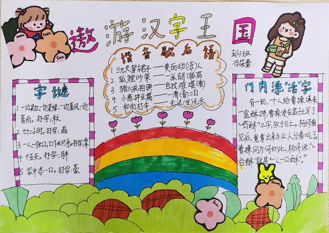 “横竖撇捺有乾坤,一笔一画成文章”。汉字之美,美在形态匀称和谐,美在意蕴隽永深厚。汉字之趣,趣在造字取象,趣在音近意通。为感受汉字的趣味,了解汉字文化,五年级的同学们,尽情遨游于汉字王国,开展丰富多彩的汉字活动。