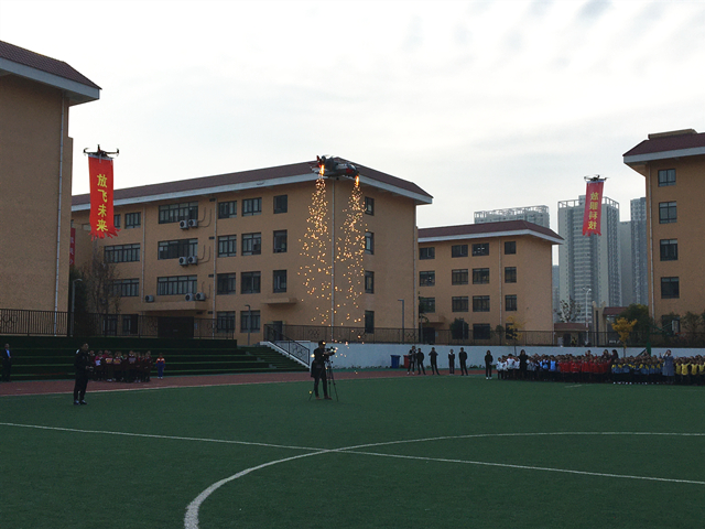 话音刚落,只见几架火箭喷射着烈焰直上青云,引起同学们的热烈欢呼,点燃了现场的氛围;